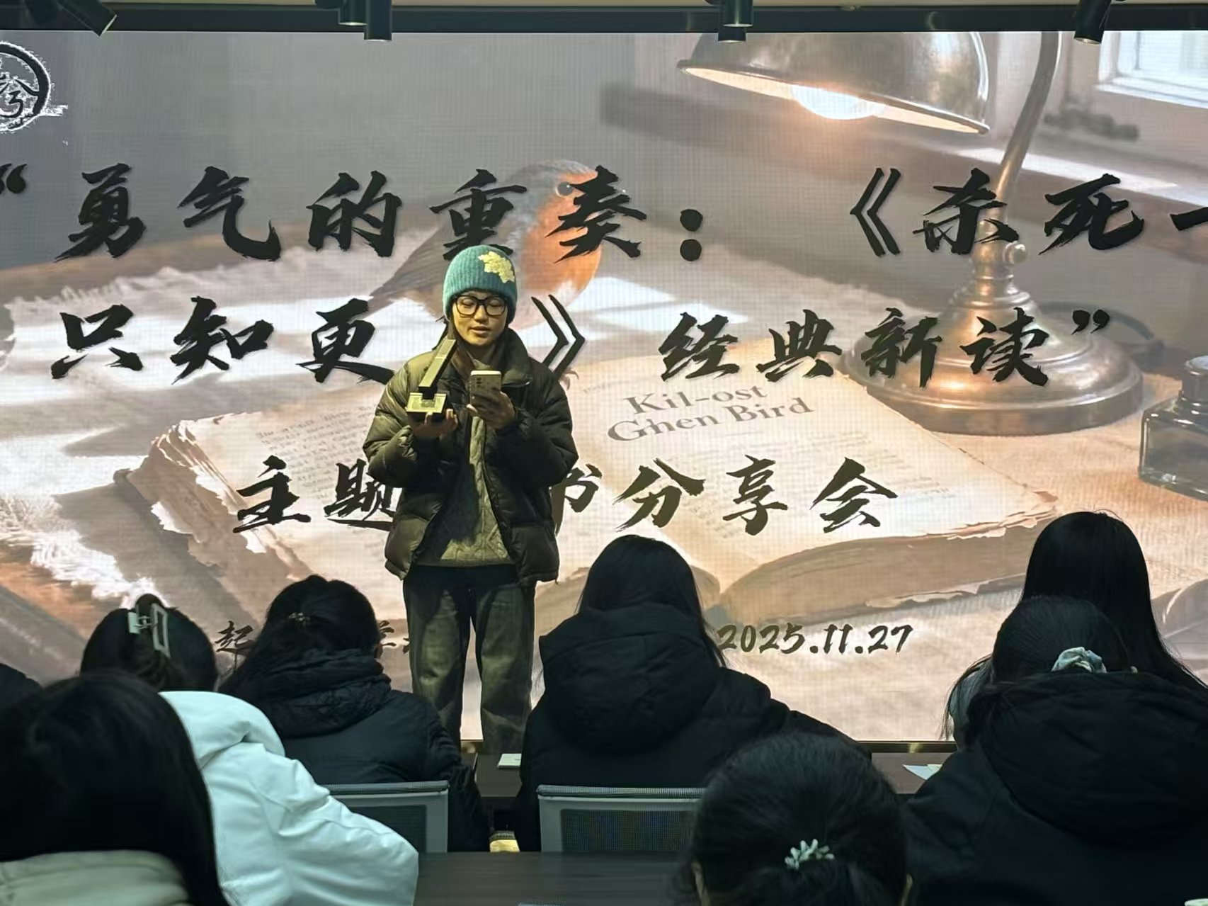 经典新读得新鲜感悟,文学交流奏勇气之歌。11月27日晚,起兮文学社在文学院会议室举办了“勇气的重奏:《杀死一只知更鸟》经典新读”读书分享会,副会长沈文洁担任主持,该活动是起兮文学社的品牌活动,通过读书分享会的形式让喜爱文学的同学表达自己的看法与见解。