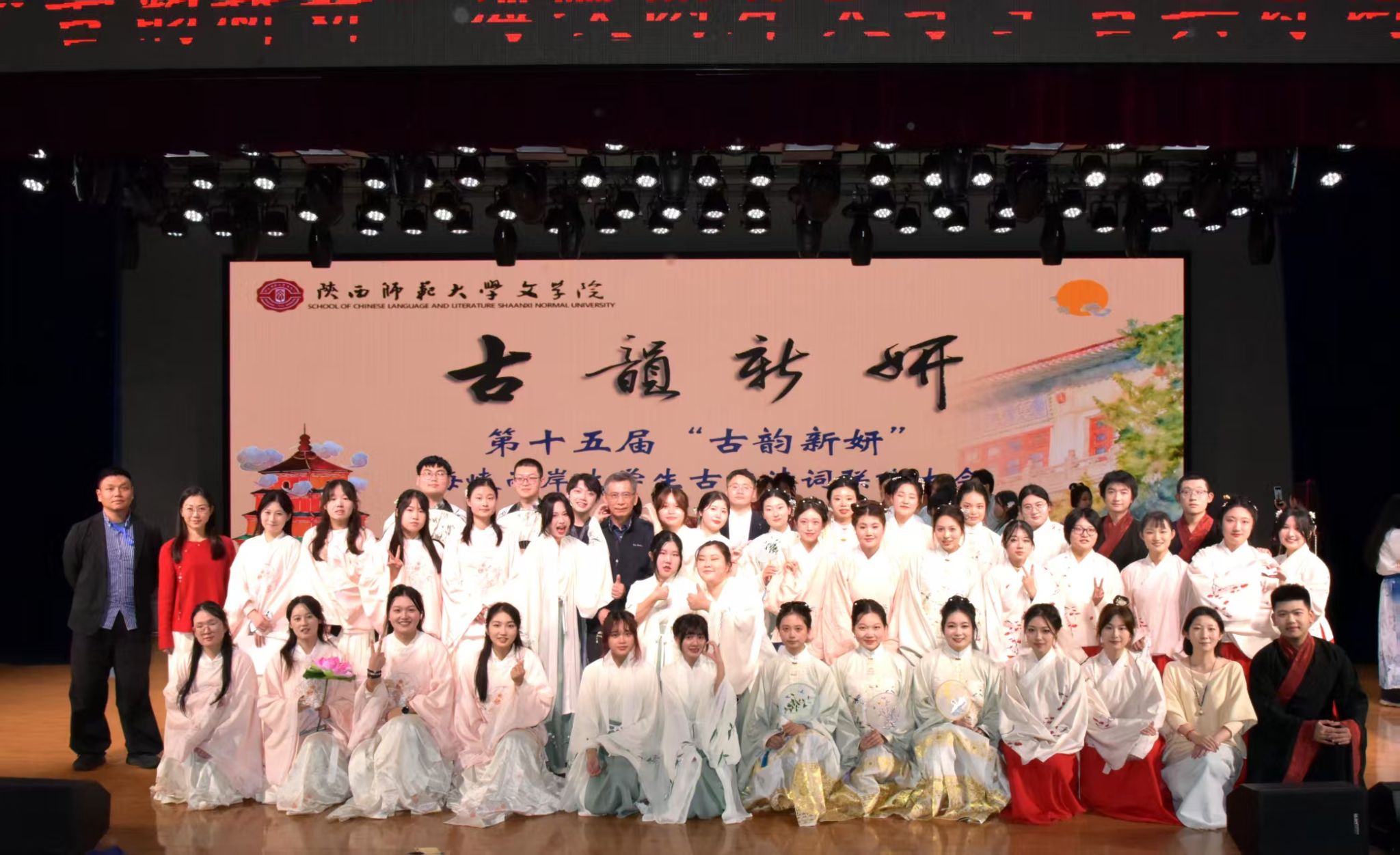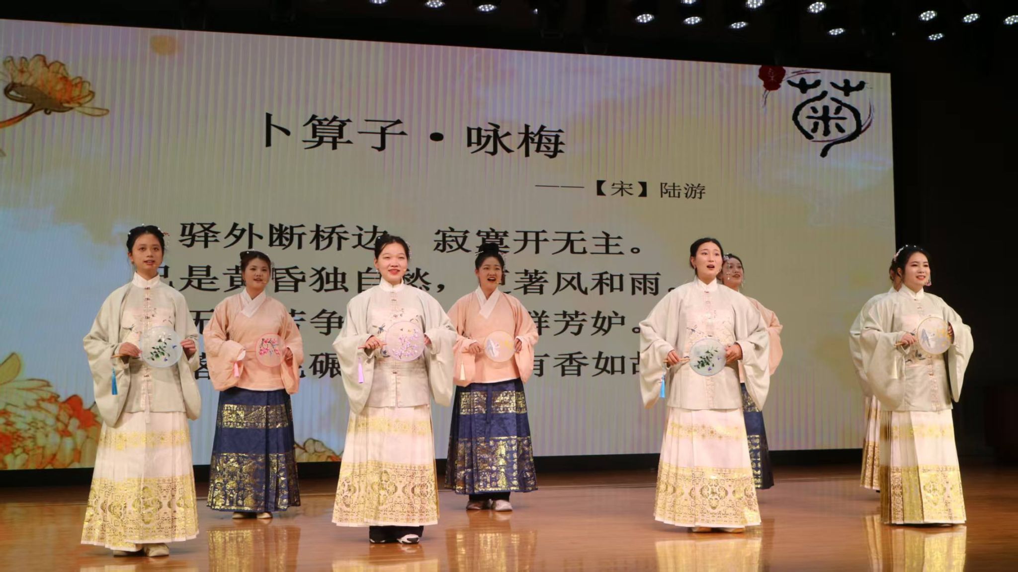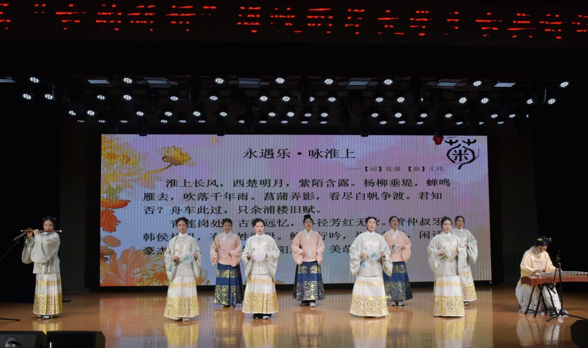 晚上,大会吟唱展演在新勇学生活动中心学生剧场举行。淮阴师范学院采菊诗社吟唱了《卜算子·咏梅》、《清平调三则》和《永遇乐·咏淮上》。张强老师作词,王玮老师作曲的《永遇乐·咏淮上》匠心独运地将对淮上美景的描摹与文化瑰宝的礼赞巧妙融合。《卜算子·咏梅》的古典韵律与《清平调三则》的现代曲风相映成趣,古筝与笛子的合奏流淌出婉转清雅的旋律,正如春风拂槛、露华凝香。采菊诗社同学们柔美深情的声线,将“名花倾国两相欢”的绝代风华娓娓道来。三首诗词在音乐上既独立成章,又气韵相连,创新传承了古典诗词的精髓,让古典诗词“活”在当下。活动尾声,全体与会师生齐诵《诗经·小雅·蓼莪》,在古老诗句中凝聚文化认同,深化情感联结。