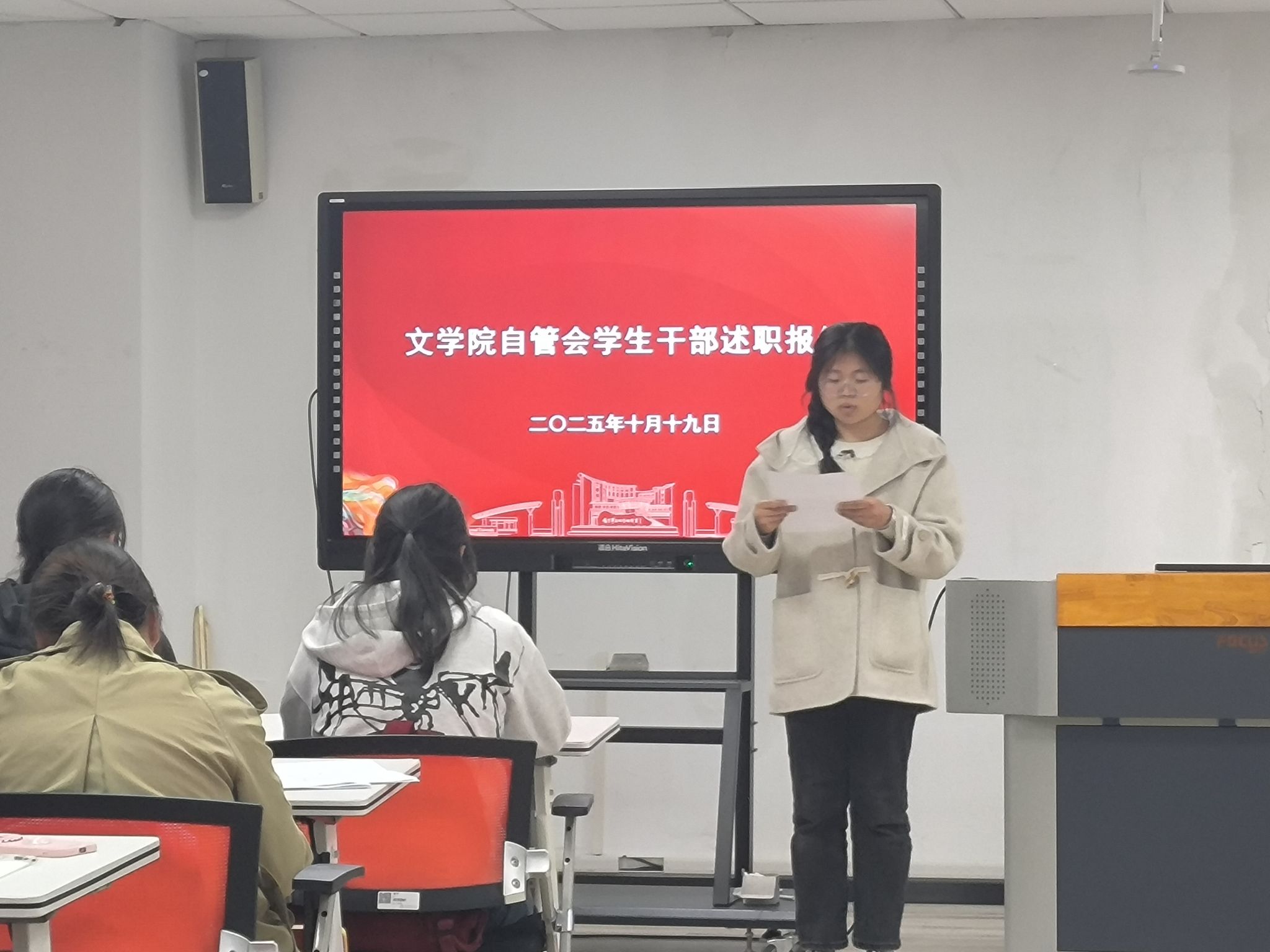 为促进学生干部角色转化,提升履职能力,近期,文学院团委、学生会、自管会三大学生组织相继召开了2025-2026学年学生干部试用期满述职会议。各组织主要负责人参加会议。