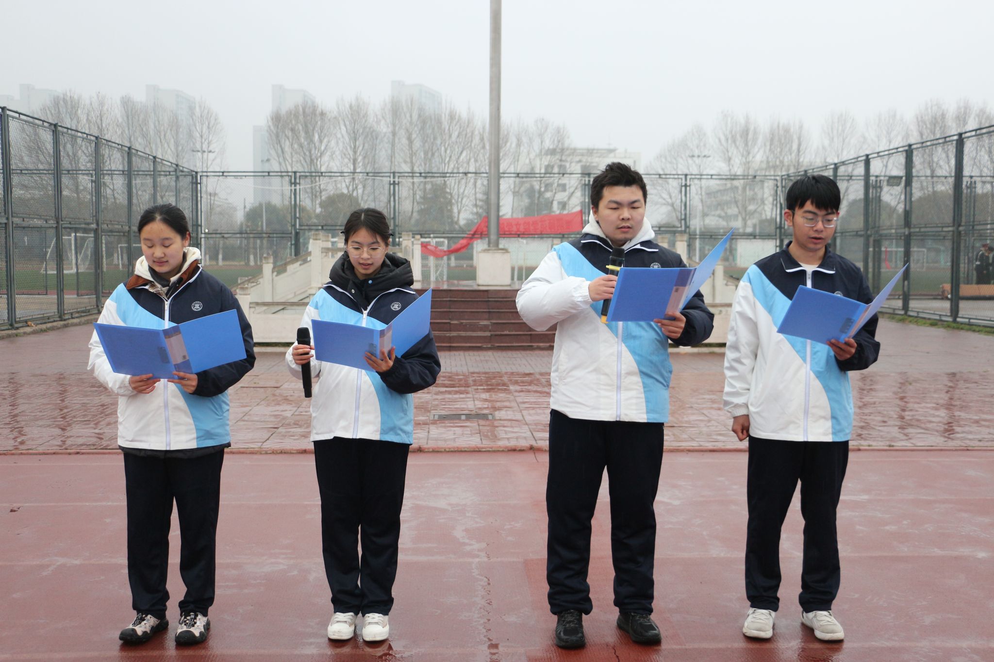 上午七时整,升旗仪式正式开始。迎着绵绵细雨,国旗班步伐铿锵,护送五星红旗步入升旗台。伴随着激昂的《义勇军进行曲》,五星红旗冉冉升起,全场庄严肃立,面向国旗行注目礼。