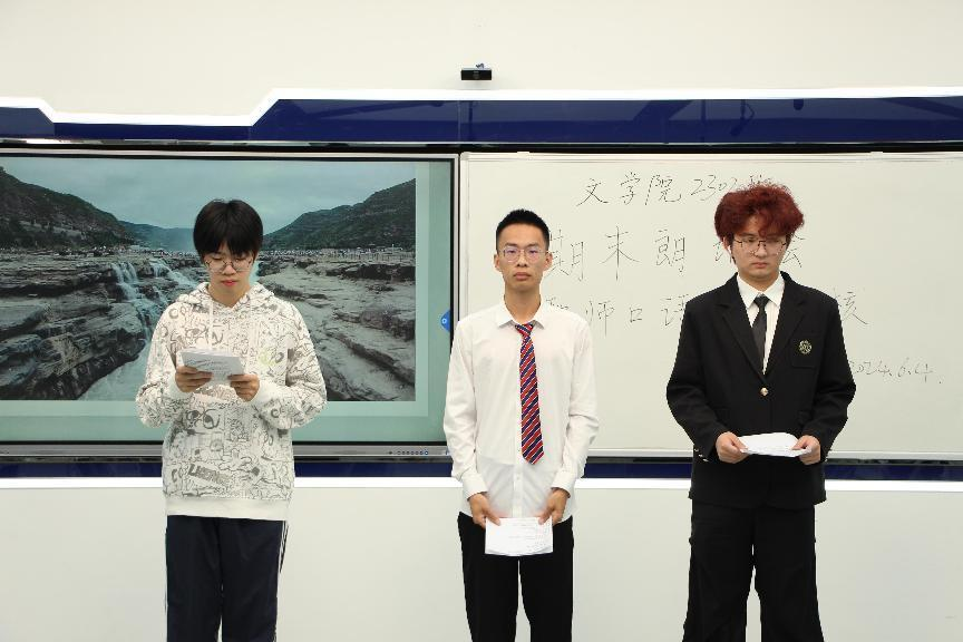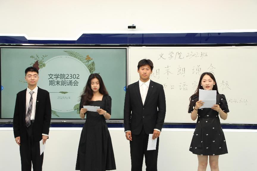 朗诵,是文字与声音的魅力结合,音文相协,带给听者灵魂深处的悸动。随着一学期《教师口语》课程接近尾声,文学院2302班于6月4日在弘文楼2-308开展“期末朗诵会:教师口语实践考核”活动,以检验并进一步提高学生口语水平。张浩、叶一一、姜尧、薛莲主持本次活动,皇甫素飞老师及张博涵、万黎勤、吴心怡、顾燚娜、乔雨桐、张悠然、邵颖等七名同学担任评委。