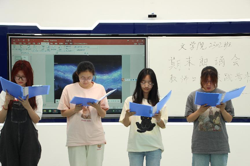 从古到今,从诗词到书信、散文,从祖国大爱到人生之感,同学们精心选择,充分准备,演绎古今圣贤的哲思,抒发家国情怀,情感饱满,淋漓尽致!同时,同学们也充分运用了老师上课讲的朗诵技巧,将理论巧妙地与实践结合,朗诵与PPT、配乐相得益彰。有的小组还采用故事串联式表演,使得整场朗诵会形式创新、内容丰富、气氛活跃。每组都有自己的亮点,在朗诵能力和技巧上都有明显的进步。同学们热情投入,沉浸在诗情画意中,意犹未尽。
