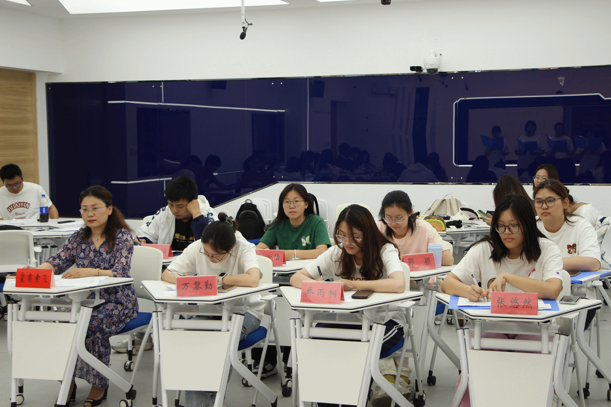 上半场活动结束,评委们一一点评,指出优点与不足。普遍问题在于同学们朗诵时缺少肢体动作,情感稍显不足。