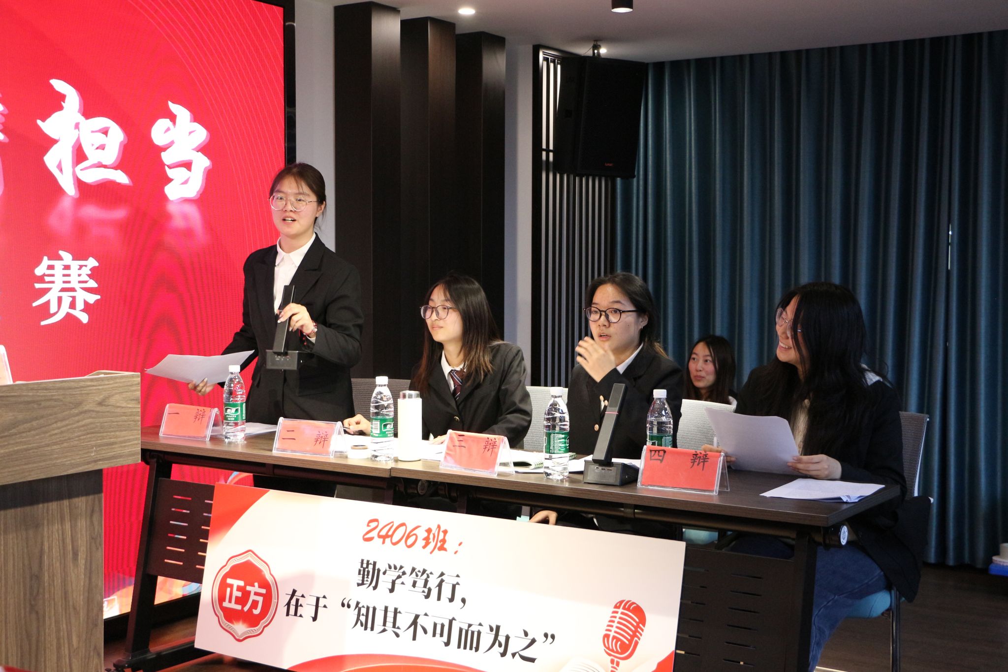 经过初赛、复赛的层层选拔,2406班、2504班两支队伍脱颖而出,晋级决赛。本次辩论赛辩题为“勤学之道,在于‘知其不可而为之’/勤学之道,在于‘知其可为而为之’”,正反双方围绕该辩题展开激烈交锋。